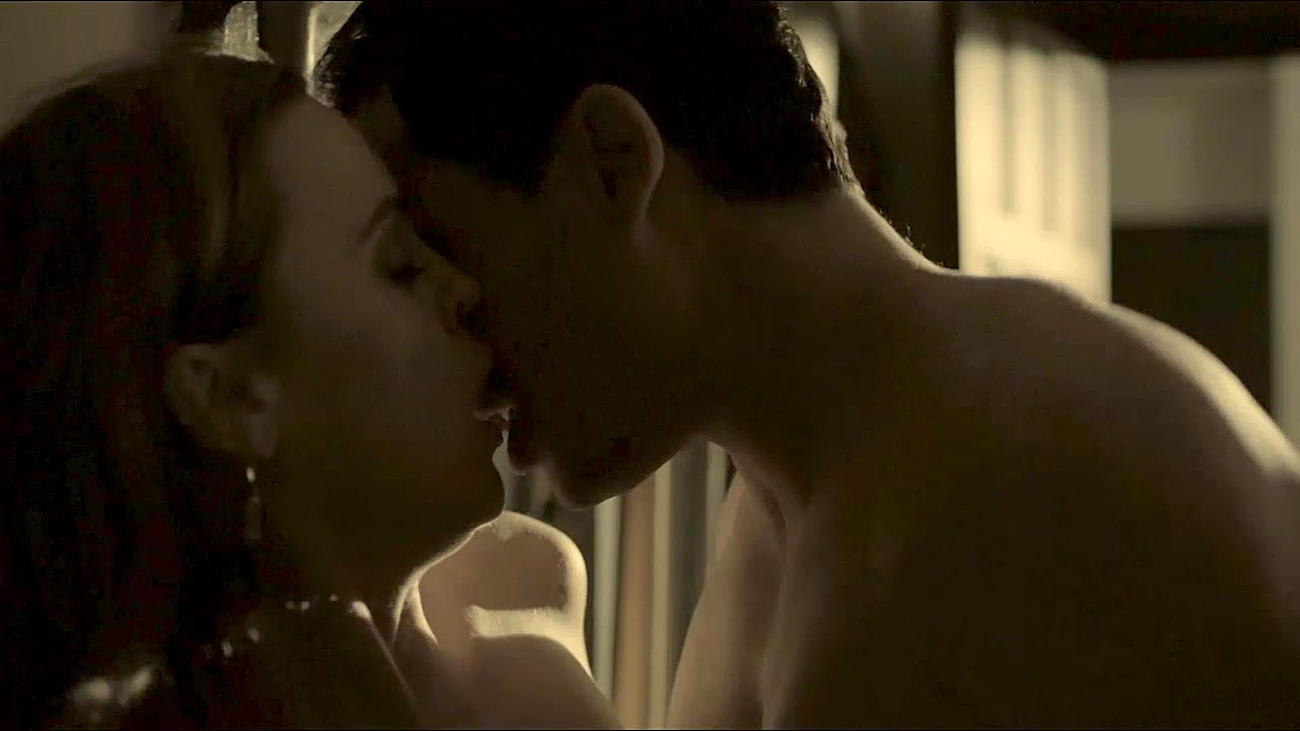 Melissa George has passionate sex in a standing position. She takes off her dress and gives us a clear view of her. A great nude sex scene from Hunted series.