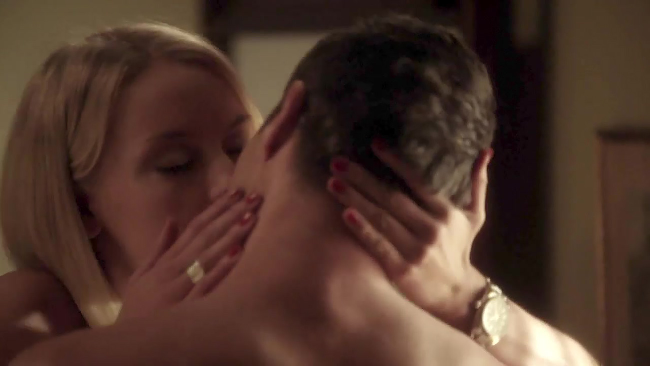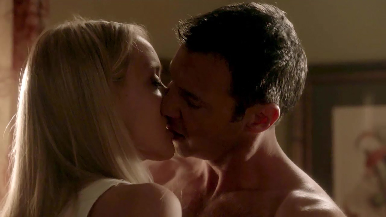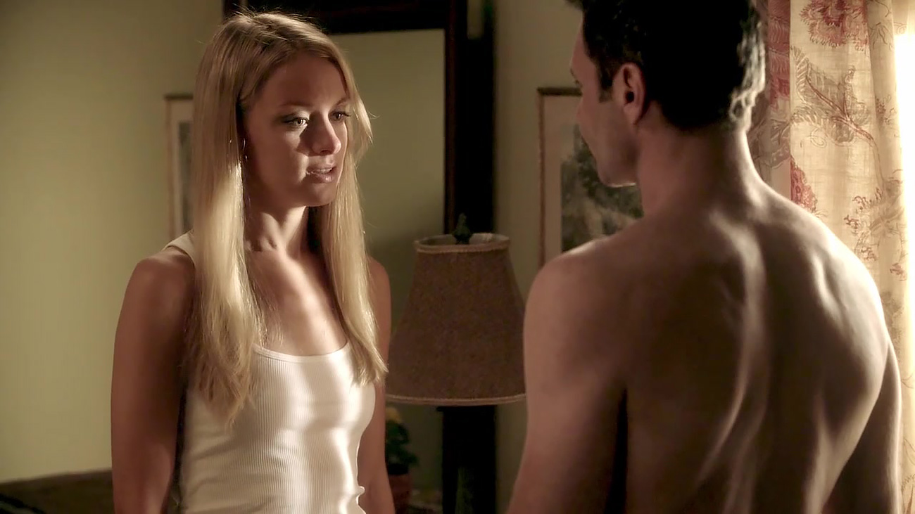 Rachel Skarsten is making out with her boyfriend and exposes naked breasts and pointed nipples. She takes off her a white tank top and the guy squeezes her tits. We get a full view of . A great nude scene from Transporter.