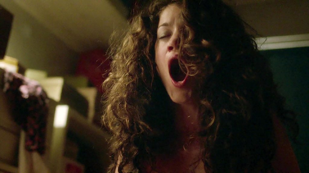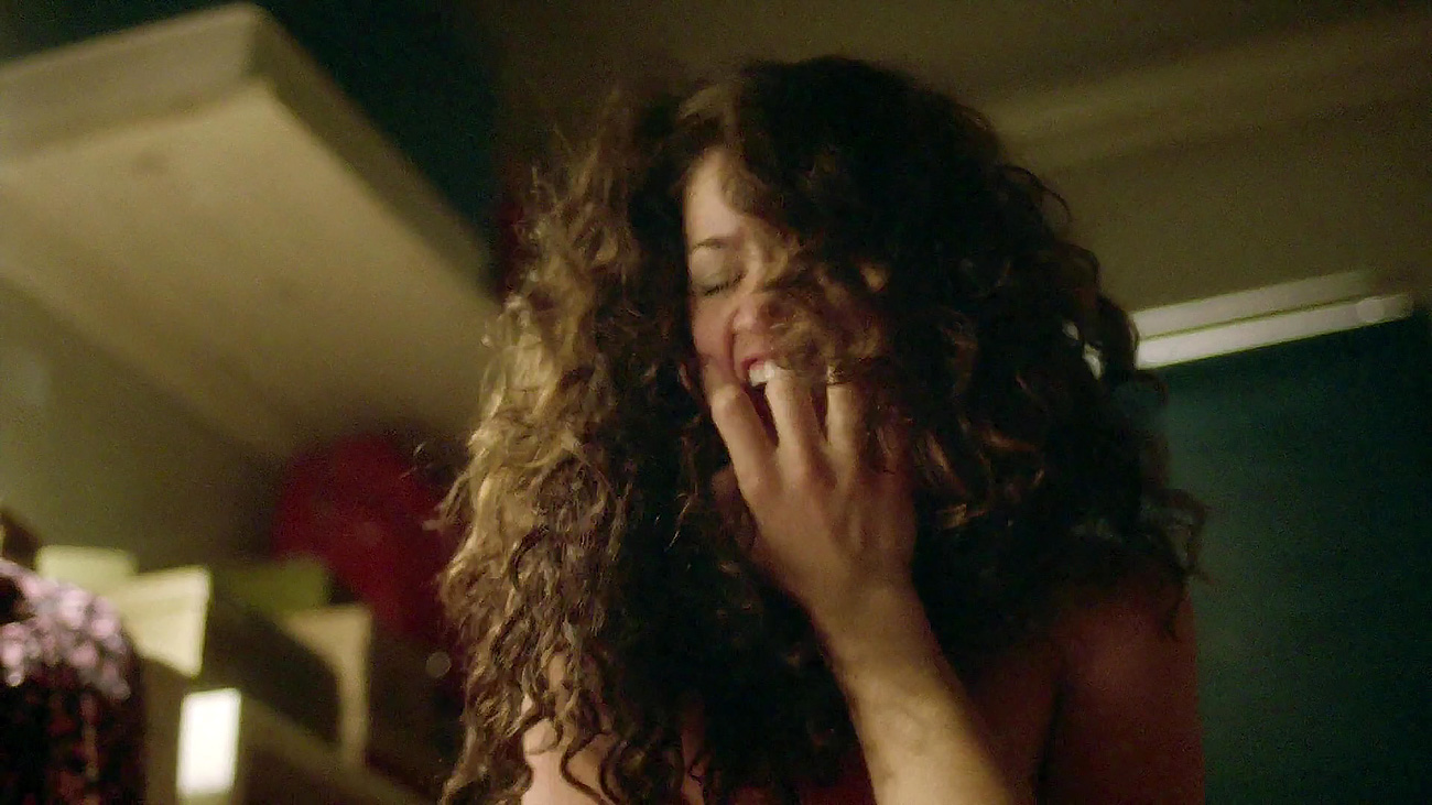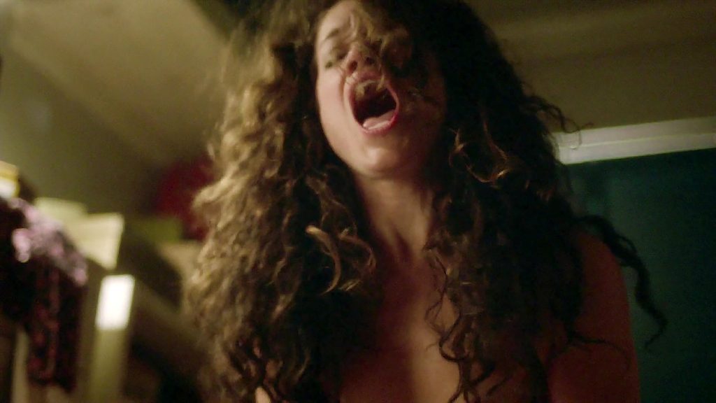 Sarah Stiles is on top of a guy and as she bites him for the finger. We can see Sarah`s nude boobs and nipples. A great nude sex scene from I’m Dying Up Here.