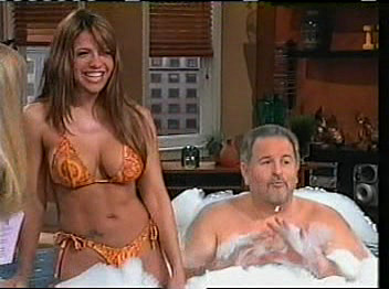 Vida Guerra exposes busty butt in a hot bathtub. She is in an orange bikini and as a fat guy lifts her from jacuzzi we get a good close view of her . A great nude scene from El Gordo y La Flaca.